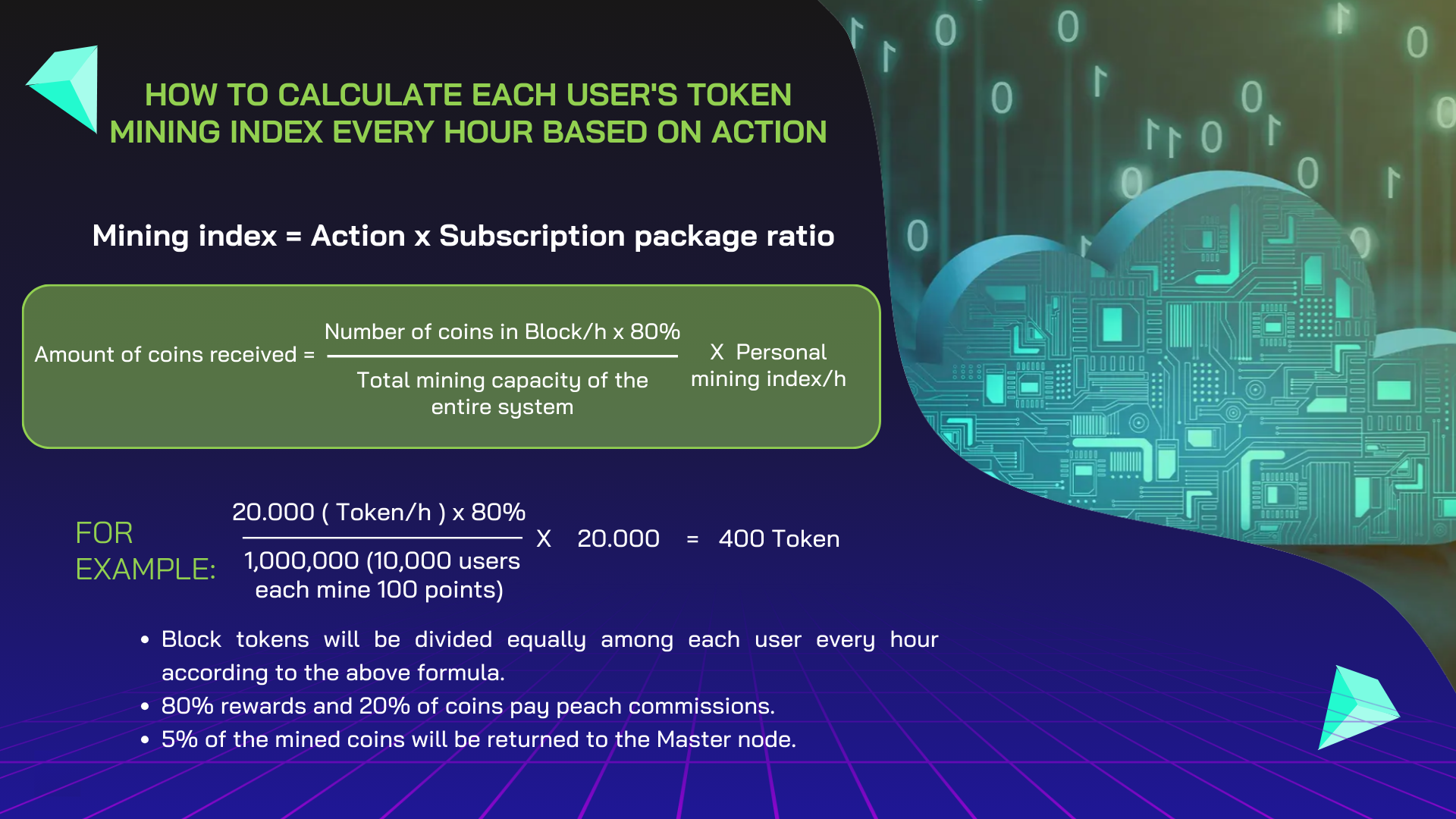 Total mining points: Total mining points: : 20.000 ( Token/h ) x 80% / 1.000.000 ( 10.000 user mα»i ngΖ°α»i ΔΓ o 100 Δiα»m) X 20.000 = 400 Token
